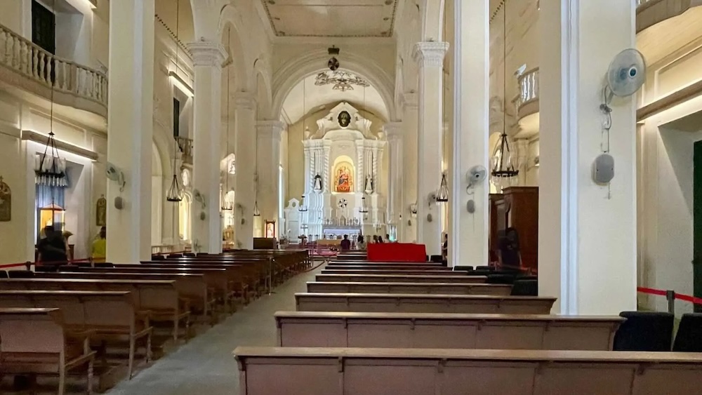 静かな教会の内部。観光地の喧騒を忘れるほど落ち着いた空間で、マカオ旅のスタートにぴったりの場所です。