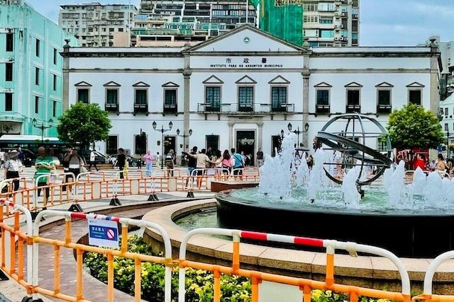 セナド広場。波模様の石畳が印象的なマカオ観光の中心地で、写真スポットとしても人気があります。
